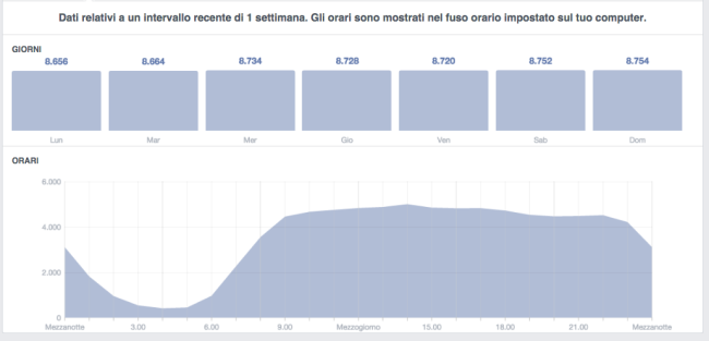 Quella nell’immagine, comunemente chiamata “balena”, è la curva media di interesse (e di utilizzo) da parte del pubblico per Facebook. A differenza di altre curve di interesse in altri settori quella del social network è davvero poco informativa e ci dice che la maggior parte del pubblico è presente in maniera costante sulla piattaforma ad esclusione delle ore tra mezza notte e le sei del mattino in cui l’interesse cala, tocca il picco più basso e poi inizia a crescere di nuovo dalle 8 del mattino.