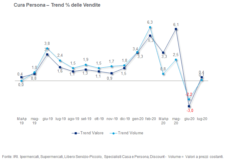 Tiene il Cura Persona: si attenua il tasso di sviluppo delle vendite nel montante di Luglio in tutti i reparti. Ma Il rallentamento della crescita è più contenuto per il Cura Persona.