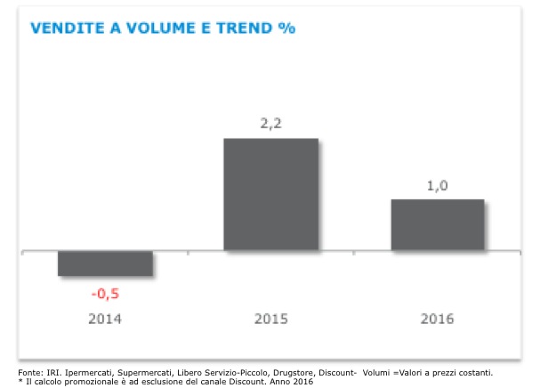 Il Largo Consumo Confezionato nell’ultimo trimestre dell’anno, complice anche un confronto con una controcifra 2015 non brillante, rimbalza in positivo raggiungendo, in media del 2016, una moderata ma pur apprezzabile crescita delle vendite a volume.