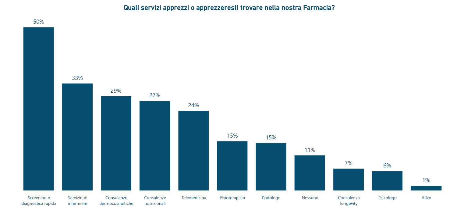 Screening e diagnostica rapida sono indicati come i servizi più apprezzati o desiderati dal 50% degli intervistati. Seguono i servizi infermieristici (33%), le consulenze dermocosmetiche (29%), i consigli nutrizionali (27%) e la telemedicina (24%).