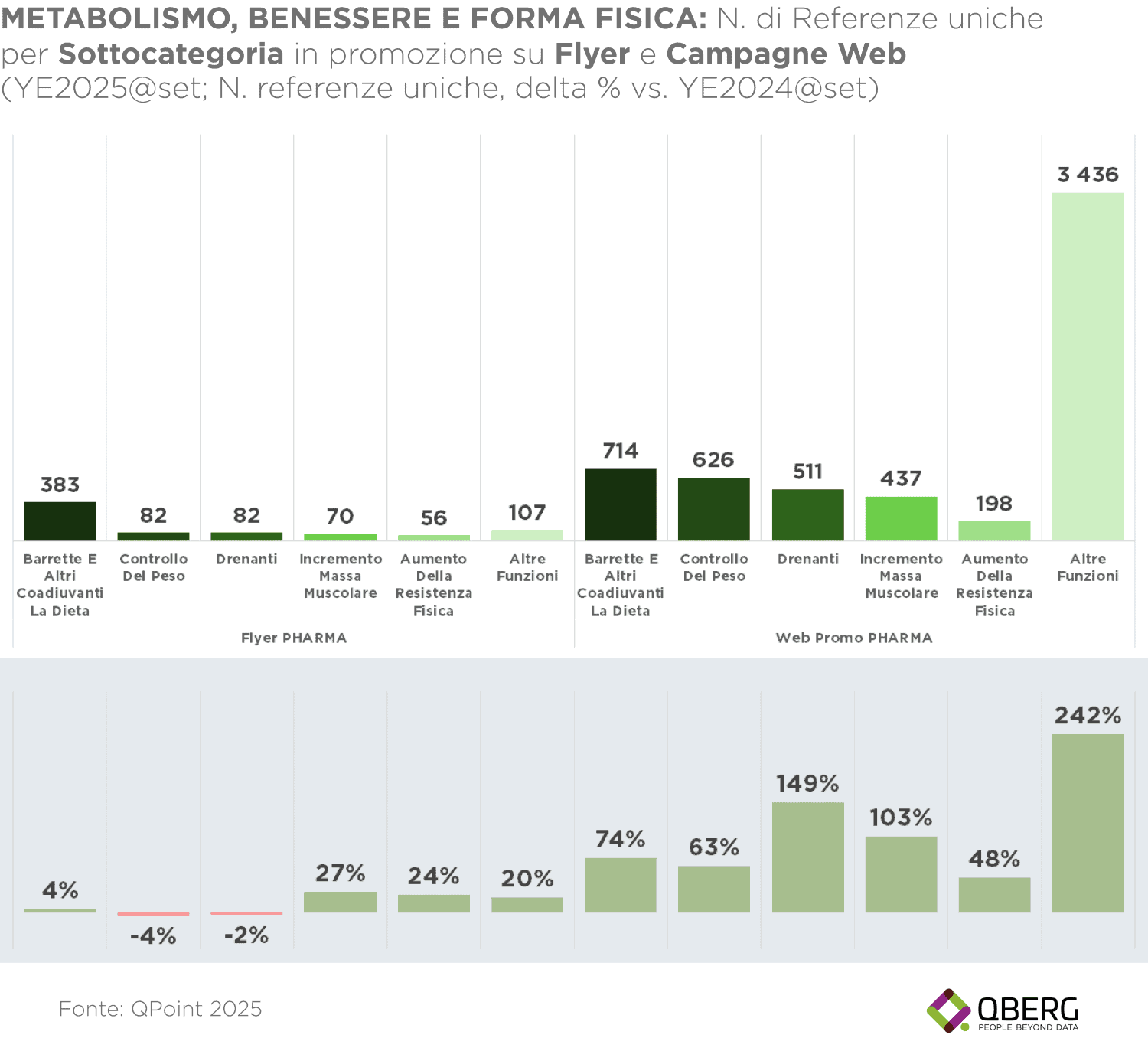 Nel digitale, invece, le promozioni aumentano in modo più consistente: i drenanti registrano un incremento a tripla cifra, seguiti dai prodotti per massa muscolare e per altre funzioni metaboliche come metabolismo glucidico, tiroide e azione termogenica.