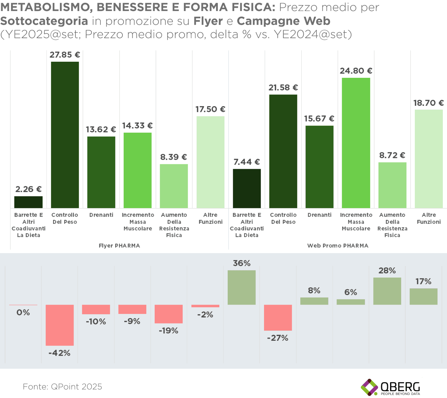 Le variazioni più significative riguardano barrette e coadiuvanti della dieta (+32%), drenanti (+10%) e prodotti per altre funzioni metaboliche (+12%). in controtendenza i prodotti per il Controllo del Peso, così come per le Farmacie, che anche nel caso delle promozioni Web avevano un costo promozionale medio unitario decisamente elevato nello YE 2024, circa €30 contro gli €21,50 dello YE 2025; mentre nel canale Flyer il prezzo medio YE era di €48 vs gli attuali quasi €28.