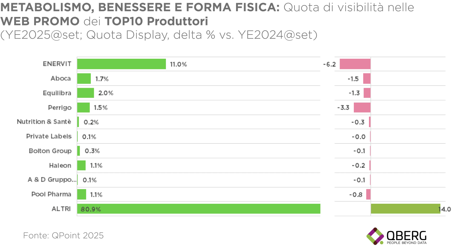 Sul canale web, il fenomeno è ancora più evidente: i produttori fuori dalla Top 10 raggiungono oltre l’80% di visibilità, con un incremento di 14 punti percentuali rispetto all’anno precedente.