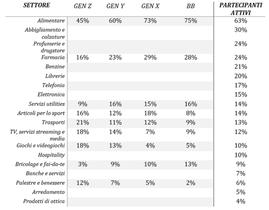 Il grocery si conferma il comparto con il livello più alto di utilizzo attivo dei programmi fedeltà, pari al 60%, con un distacco netto rispetto a tutti gli altri settori.