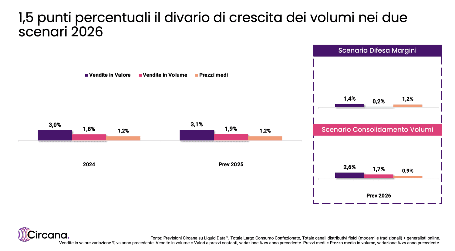 Dopo un 2025 che, secondo le stime, dovrebbe chiudersi con volumi in crescita del +1,9%, prezzi medi a +1,2% e ricavi a +3,1%, il prossimo anno si configura come un passaggio in cui le scelte della filiera su prezzi e promozioni potranno produrre risultati differenti.