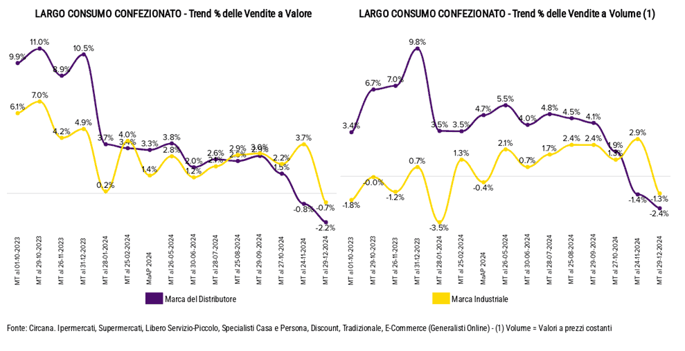Al contrario, i canali emergenti si mostrano più dinamici: gli Specialisti Casa e Persona registrano un incremento del +5,6% a valore, mentre l’E-commerce cresce del +6,9%, con un picco del +14,0% a dicembre. Annus horribilis per il Discount, che perde ancora nei volumi: dopo un 2022 positivo con una crescita del +3,5%, il 2023 ha segnato una contrazione del -0,6%, peggiorata ulteriormente nel 2024 con un calo del -3,5%.