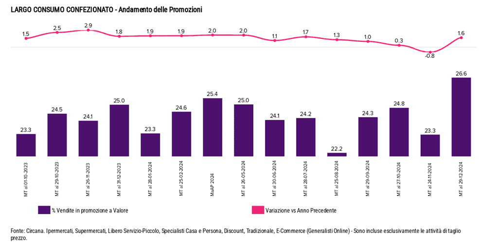 Le attività promozionali crescono significativamente nel 2024, raggiungendo il 26,6% a dicembre, con uno scarto positivo di +1,6 punti percentuali rispetto all’anno precedente. Un incremento che riflette la competizione crescente tra i player del mercato, con strategie promozionali sempre più mirate a conquistare l’attenzione di consumatori attenti al risparmio.