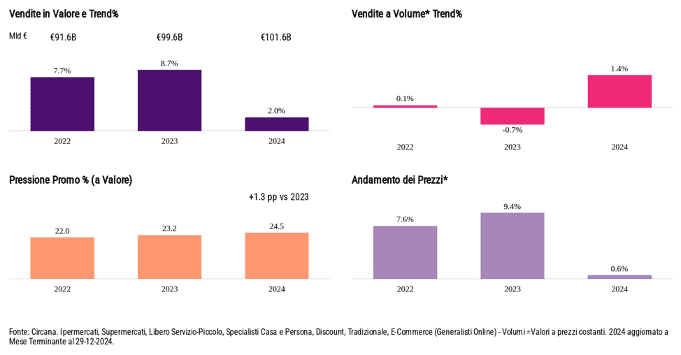 ll mercato del Largo Consumo Confezionato (LCC) chiude il 2024 con segnali contrastanti. Dai dati Circana, vediamo che a valore si registra una crescita del +2,0%, mentre i volumi hanno un incremento più contenuto dell’+1,4%