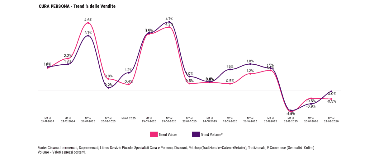 Febbraio non porta inversioni di rotta per il Personal Care che chiude il mese a –0,5% a volumi, in linea con Cura Casa (–0,5%). È una flessione che si prolunga ormai da diversi mesi e che nel progressivo YTD non accenna a rientrare. In controtendenza il Petcare che chiude a +0,3%.