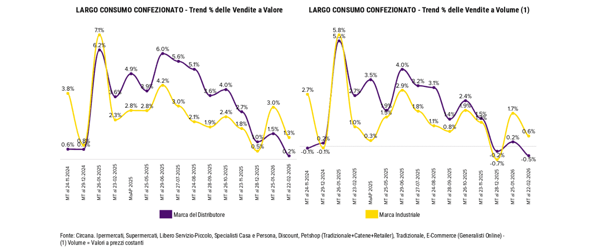Sul fronte competitivo la marca del distributore cede ancora terreno. Nel progressivo YTD si attesta al 29,9%, perdendo 0,3 punti percentuali a favore delle marche industriali; a febbraio raggiunge il 30,1%, con una flessione di –0,2pp rispetto all’anno scorso. Le promozioni riprendono vigore dopo il mese piatto di gennaio: la pressione promozionale sale al 24,4% (+0,6pp), mentre gli sconti si attestano al 24,5% (+0,2pp).
