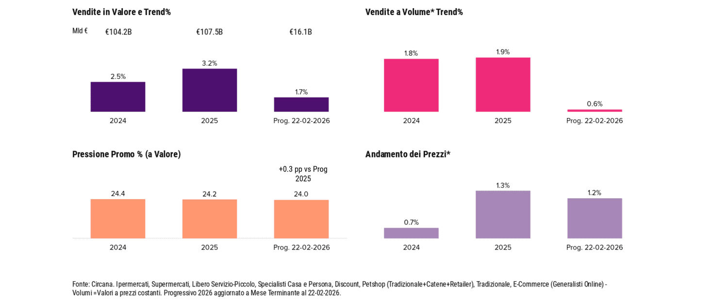 Febbraio segna una battuta d’arresto per il Largo Consumo Confezionato. Il valore cresce appena dello 0,9% e i volumi si fermano a zero, interrompendo il recupero avviato a gennaio. Il report mensile Circana fotografa un mercato che nei primi due mesi dell’anno non riesce a trovare continuità: il progressivo YTD cresce del +1,7% a valore e del +0,5% a volumi, ma porta già i segni di un febbraio più debole delle attese.