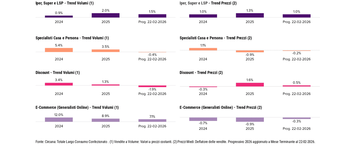 Anche a febbraio i supermercati sotto i 2.500 mq si confermano il formato più dinamico, con un +2,9% a volumi nel progressivo. I superstore tengono il passo a +1,0%, mentre ipermercati e libero servizio piccolo continuano a cedere terreno, rispettivamente a –1,3% e –1,2%. Negativi anche gli specializzati casa e persona, a –0,4%. Il discount chiude il mese in negativo a valore (–1,0%) e si attesta sotto quota 20 nel progressivo. Il drugstore, dopo mesi di flessione, torna in territorio positivo: +0,3% nel mese, con quota stabile al 5,0%. I generalisti online proseguono la crescita a ritmi sostenuti: +6,4% nel progressivo, +6,9% a febbraio, con una quota di mercato che sale al 3,4%.