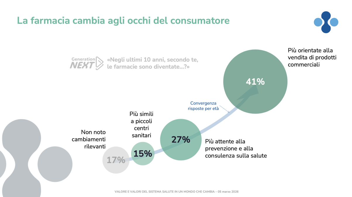 Farmacie indipendenti e insegne hanno livelli di soddisfazione differenti rispetto a questi bisogni. Per quanto riguarda la percezione del cambiamento della farmacia negli ultimi 10 anni, il 41% degli intervistati nella ricerca Generation Next ha risposto che sono diventate ‘più orientate alla vendita di prodotti commerciali’, il 27% ‘più attente alla prevenzione e alla consulenza sulla salute’, il 15% ‘più simili a piccoli centri commerciali’. Infine il 17% non nota cambiamenti rilevanti.