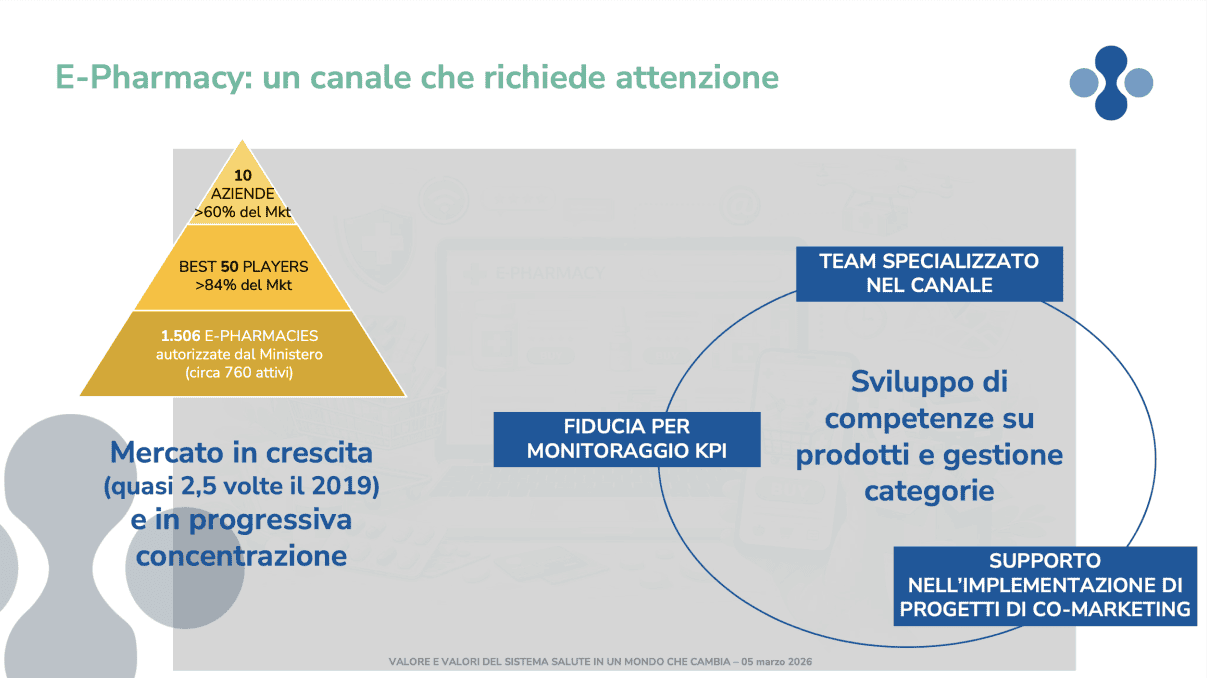 Infine per quanto riguarda l’e-commerce «pur con 1500 e-pharmacy autorizzate dal Ministero, il 60% del mercato è fatto da 10 realtà». Cosa chiedono le e-pharmacy alle aziende? «Un team specializzato nel canale; fiducia per il monitoraggio; supporto nell’implementazione di progetti di co-marketing ad hoc per il canale» ha concluso Convertini.