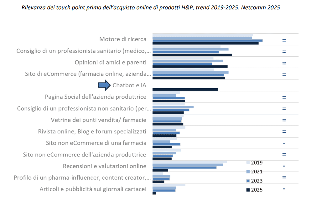 Nel 2025 la novità più evidente riguarda la presenza di AI e chatbot all’interno del percorso. In pochi anni questi strumenti sono entrati nella top 5 dei touchpoint pre-acquisto, fino a conquistare un ruolo fra i primi tre canali di informazione per categorie specifiche, ad esempio creme e pomate, prodotti alimentari per diete speciali, ottica e strumenti medici o ortopedici.
