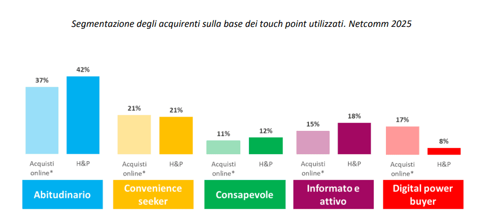 La quota più consistente è composta dagli “Abitudinari”, che rappresentano il 42% degli acquirenti. Sono utenti che tendono a compiere percorsi semplici, con un numero molto limitato di touchpoint: spesso raggiungono direttamente il sito di e-commerce di riferimento, fidandosi dell’esperienza precedente. All’estremo opposto si colloca una minoranza di “Digital Power Buyer”, pari a circa l’8%: per questi consumatori il customer journey è molto articolato, con una media di 6,6 touchpoint, fra motori di ricerca, social, content creator, piattaforme di recensioni e strumenti di Intelligenza artificiale.