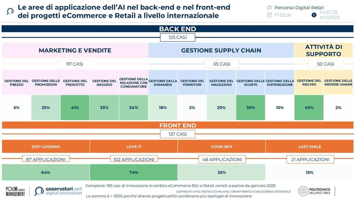 L’analisi dei 183 casi di innovazione censiti dal 2025 mostra un impiego dell’Intelligenza Artificiale sia nel front end (137 casi) sia nel back end (125 casi). Le applicazioni più ricorrenti riguardano la gestione delle promozioni (74%) e del prezzo (64%), seguite dalla gestione della domanda (40%). Incidenze rilevanti si registrano anche nella relazione con il consumatore e nei processi di magazzino (39%), con un’estensione che interessa marketing e vendite, supply chain e attività di supporto.